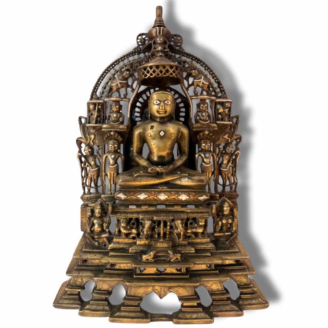 In addition to the five Jinas, the idol includes animals like a lion, elephant, and cow. Accompanying them are the Siddhayika Yakshi and Matanga Yaksha, along with attendants holding chauris (flying whisks). The Tirthankaras bear the gem called Shrivatsa, an important symbol of the Jinas, which represents purity.