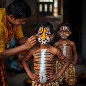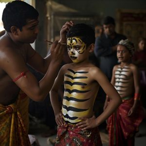 Around the months of September and October each year, as the ten day festival of Dussera approaches, boys and men in the Dakshin Kannada in southwest India, in the region of Karnataka, prepare to become the character of a tiger in terms of looks and certain traits. The tiger, the Goddess Durga’s steed, is an animal that is at once fierce and beautiful, an emblem of wild majesty. It so happens that the thick forests of the Western Ghats that run through the area are among the few landscapes in India, home to Panthera tigris tigris, the Bengal tiger.