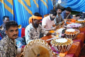 The tiger does not dance alone it moves to the heartbeat of the taase, the powerful drum that sets the pace for every leap, crouch, and prowling step. Its deep, resonant tones echo through the streets, pulling spectators into the performance and charging the air with anticipation. Accompanying the taase are other percussion instruments like the chende and maddale, each adding layers of rhythm, while cymbals and, at times, the harmonium provide melodic accents. Together, they create a dynamic soundscape that guides the dancers, animates the tiger’s movements, and transforms streets into stages. In Pilivesha, the music is more than accompaniment; it is part of the ritual itself. The drummers and musicians engage in a dialogue with the dancers, building tension, releasing energy, and keeping the tiger alive with every beat. The rhythm pulses like a living heartbeat, ensuring that both performers and audience experience the power, devotion, and exhilaration of this centuries-old folk tradition.